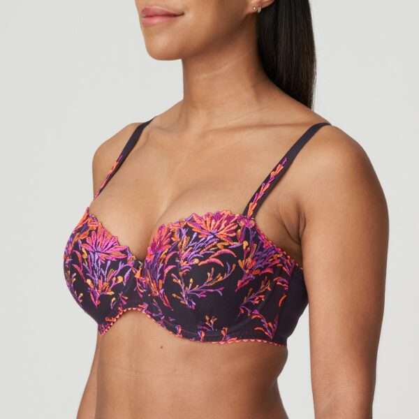 Verleidelijk en kleurrijk, deze balconnet-bh met mousse cups. De cups zijn versierd met all-over broderie in felle kleuren. contrasterende guipure aan de straps maken je zomerse look compleet.