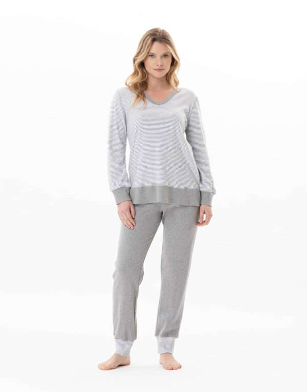 Gemêleerd grijze afwerkingen: zoom van het bovenstuk, afgeronde V-halsafwerking, brede boorden aan de lange mouwen en onderaan de broek.