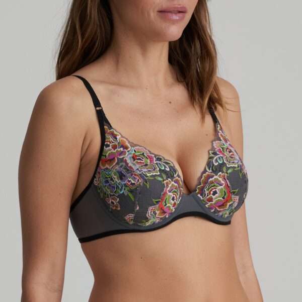 Het decolleté van deze mousse bh lijkt op de punt van een hart. De cups lopen van diep in het midden naar hoog opzij en omvatten de welving van je borsten.