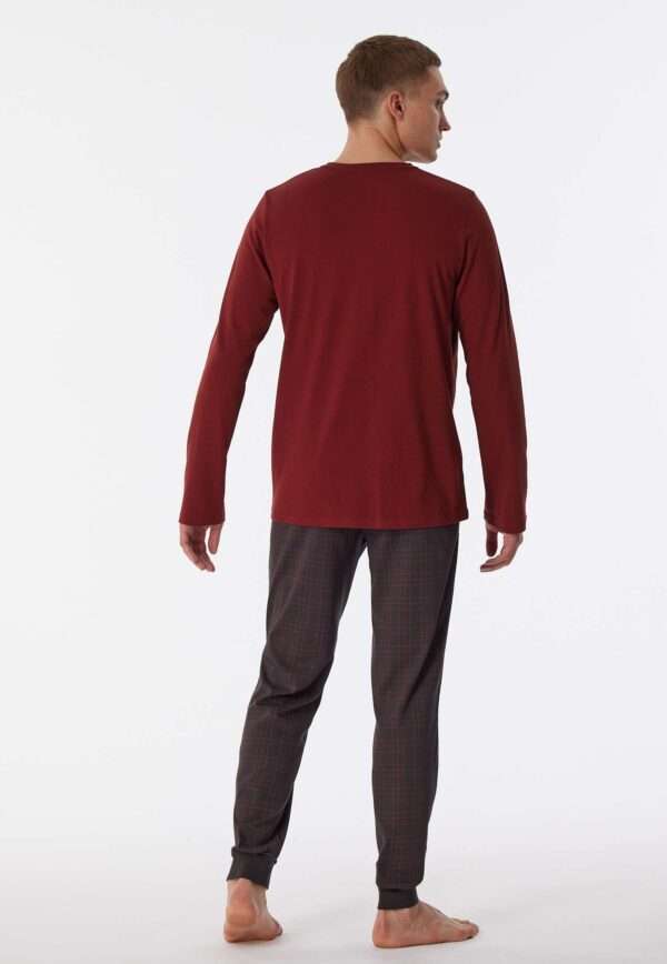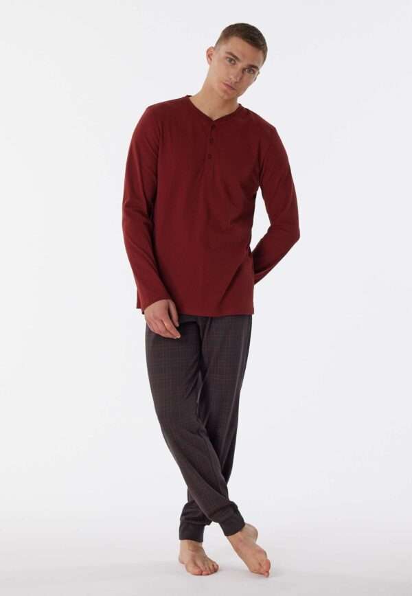 Lange herenpyjama met roodbruin bovenstuk en geruite broek in terracotta en antraciet, uit de SCHIESSER-serie “Fine Interlock”. Effen shirt met lange mouwen, serafinokraag en functionele knoopsluiting. Geruite broek met comfortabele tailleband en ton-sur-ton koordsluiting, eenkleurige manchetten aan de beenuiteinden. Van hoogwaardige, aangenaam zachte interlock van 100% katoen.