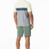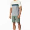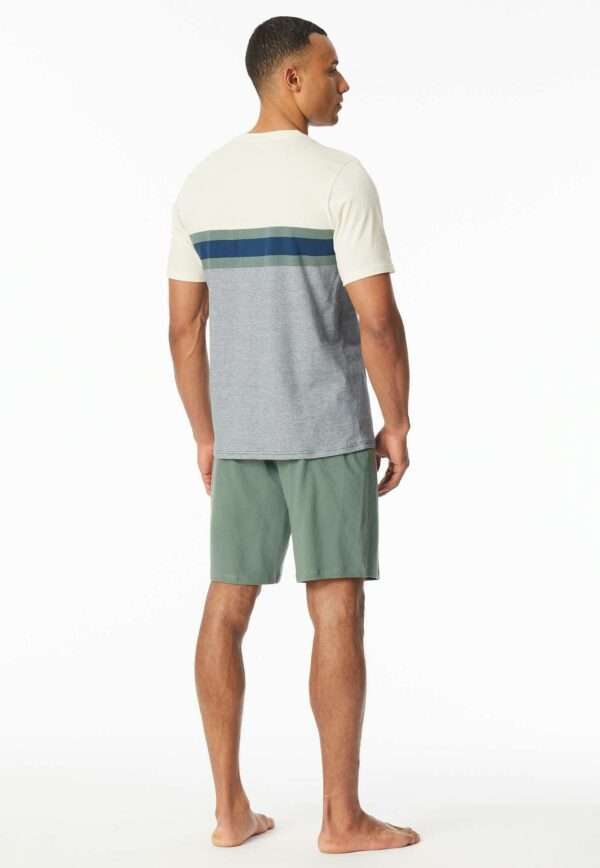 Korte heren pyjama met blauw, wit en geel shirt en short in kaki, uit de SCHIESSER-serie “Casual Nightwear. Shirt met geplaatste strepen. Short in effen kleur met strik in de tailleband, onze modellen zijn 186 cm en 189 cm lang en dragen maat 50/M, in soepele Single Jersey stof met 100% Organic Cotton.