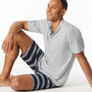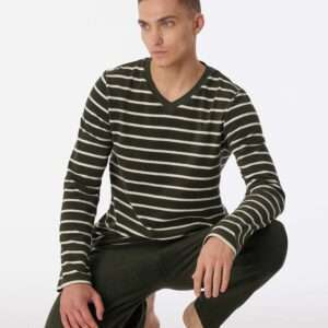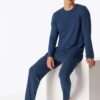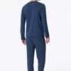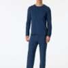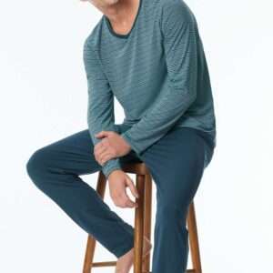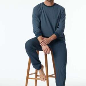 Pyjama lang admiral blauw voor heren met gestippelde bladprint, uit de SCHIESSER “Long Life Soft” collectie. Effen shirt met lange mouw, ronde hals, gedessineerde broek met zacht geweven elastische tailleband, discreet glanzend en bijzonder glad. Soepel oppervlak, duurzaam, pluisvrij materiaal met optimale vochtregulatie. Ons model is 187 cm lang en draagt maat 50/M, in elastische, vormvaste single-jersey kwaliteit.