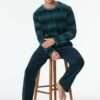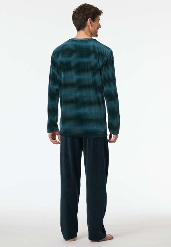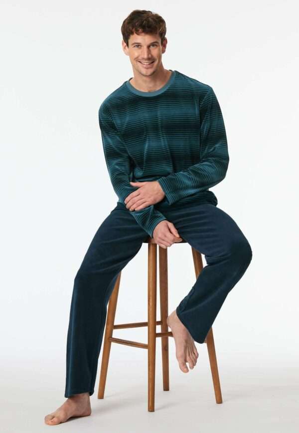 Lange herenpyjama in denimblauw, uit de SCHIESSER-lijn ‘Casual Nightwear’. Bovenstuk met strepen, ronde hals, manchetten aan de armen en zoom. Broek in effen nachtblauw, van aangenaam zachte velourskwaliteit.