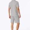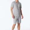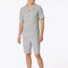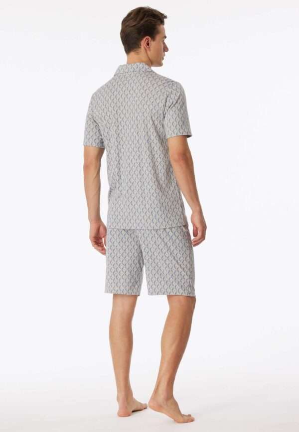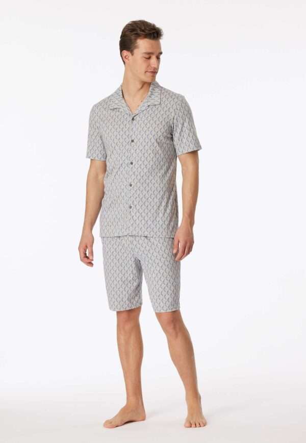 Korte grijs gevlekte pyjama voor heren, uit de SCHIESSER “Fine Interlock” serie. Elegant retropatroon in nachtblauw, antraciet en wit. Klassieke kraag en functionele knoopsluiting. Short met comfortabele meernaald-tailleband en grijsgemêleerd bindkoord. Ons model is 187 cm lang en draagt maat 50/M, in hoogwaardige, aangenaam zachte kwaliteit van fijne interlock.