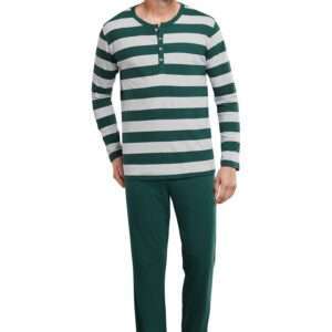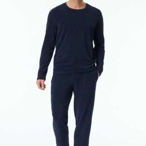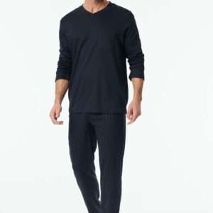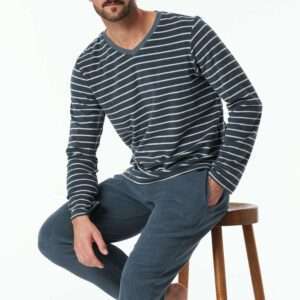 Lange pyjama voor heren in denimblauw, uit de SCHIESSER-lijn “Long Life Soft”. Shirt met strepen en v-hals, effen broek, subtiel glanzend en bijzonder glad, soepel oppervlak, duurzaam, materiaal met optimale vochtregulatie.