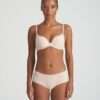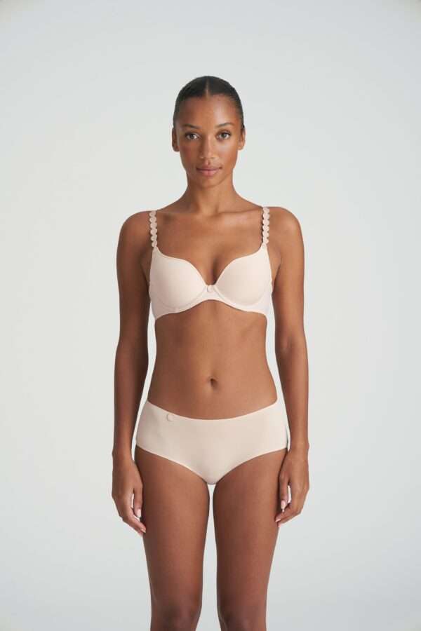 Mousse bh met hartvormige cup. De cup omvat bovenaan een groot deel van de borst. De hoge decolletébelijning boven de borst loopt diep omlaag tussen de borsten. De rug is recht en in transparante tule. De schouderbandjes kan je recht of om de hals dragen.